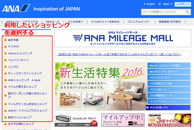 1)「ANAマイレージモール公式ホームページ」にいって、利用したいショッピングサービス(画面左)から選択します。
