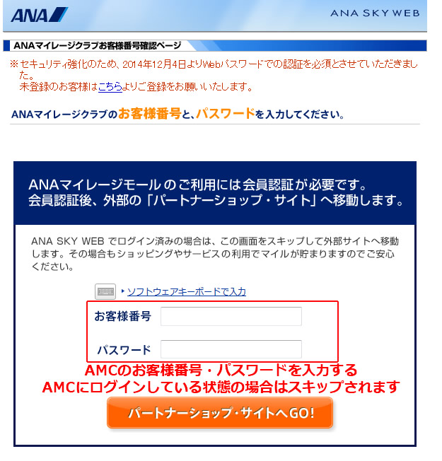 3)AMC(ANAマイレージクラブ)のログイン情報を求められます。ここでログインしたお客様IDに対してANAマイレージモールで利用したマイルがプレゼントされます。