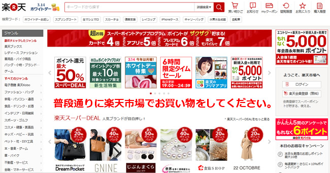 4)提携サービス(今回の場合は楽天市場)のページに遷移しますので、普段通りのお買い物をお楽しみください。提携サービスのポイントは通常通り付与され、後日ANAマイレージモールよりANAのマイルが別途AMC会員にプラスして付与されます。